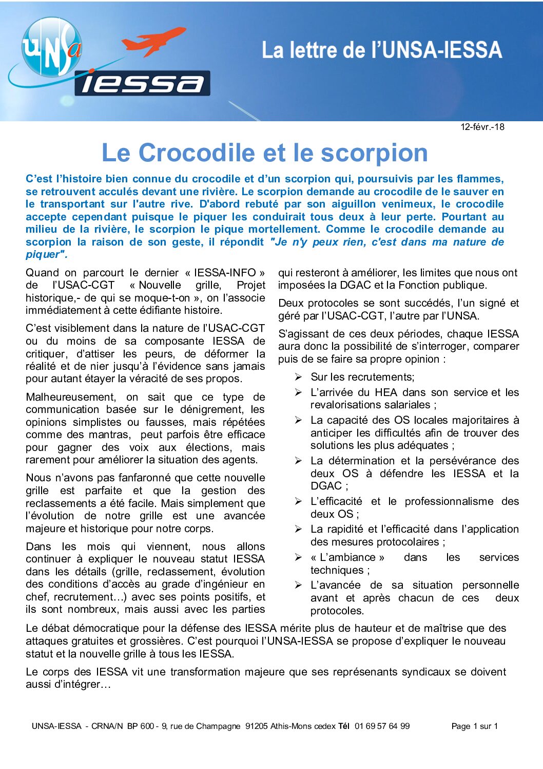View Larger Image Le crocodile et le scorpion By admin5313|2018-02-13T08:21:55+00:0013/02/2018|National|Commentaires fermés sur Le crocodile et le scorpion Share This Story, Choose Your Platform! FacebookXBlueskyRedditLinkedInWhatsAppTelegramTumblrXingEmailCopy Link About the Author: admin5313 Related Posts GT Effectifs IESSA Gallery GT Effectifs IESSA AVE Printemps 2026 Gallery AVE Printemps 2026 Le conseil d’état censure la dgac Gallery Le conseil d’état censure la dgac Campagne de mobilité FIDELO 2026-1 Gallery Campagne de mobilité FIDELO 2026-1